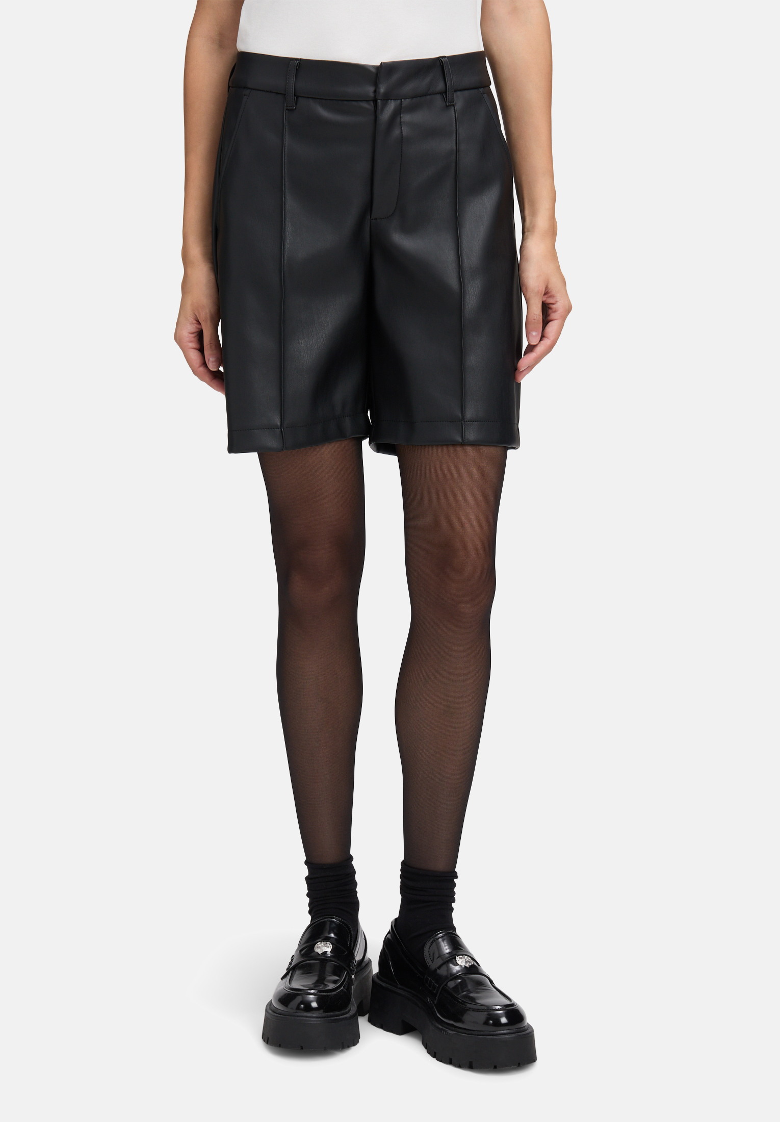 Auf der Suche nach einem Lieblings-Fashion-Piece? Diese Kunstleder-Shorts überzeugen mit figurbetonter Passform, edlem Material und einem cleanen Uni-Design. Der Mid Waist-Sitz, ein Reißverschluss sowie praktische Eingrifftaschen machen sie zum stilvollen und zugleich funktionalen Highlight für elegante Looks mit modernem Twist.