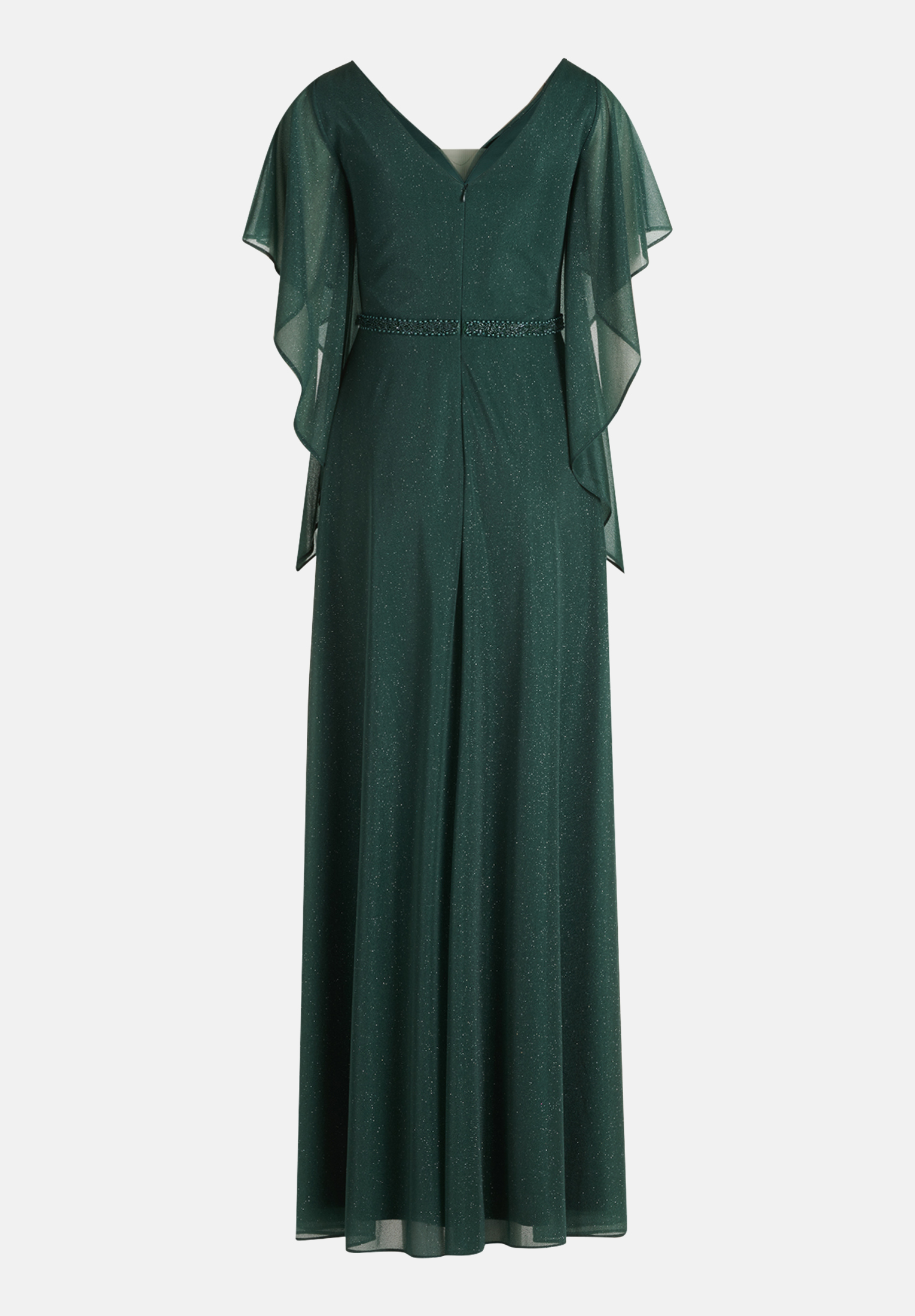 Dieses Abendkleid ist ein wahrer Blickfang und bringt Sie zum Strahlen! Die filigrane Stickerei auf dem zarten Netzstoff verleiht ihm eine besondere Eleganz, während die Falten und der leicht taillierte Schnitt Ihre Figur schmeichelhaft betonen. Der V-Ausschnitt und die eleganten Volantärmel unterstreichen den femininen Look des Kleides. Halbarm und mit einem praktischen Reißverschluss versehen, ist dieses unifarbene Kleid die perfekte Wahl für festliche Anlässe, bei denen Sie strahlen möchten.